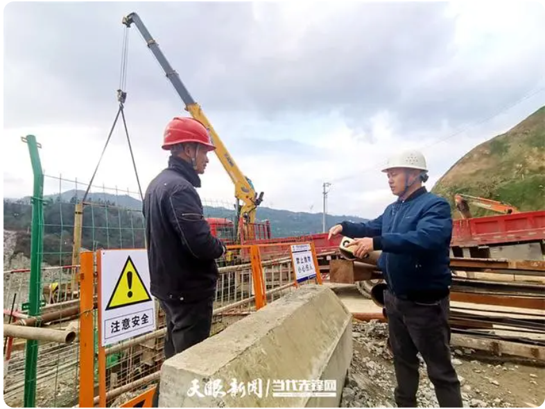鳳山水庫(kù)工程建設(shè)管理部工程管理室主任簡(jiǎn)杰(右)和工程人員進(jìn)行施工交流。